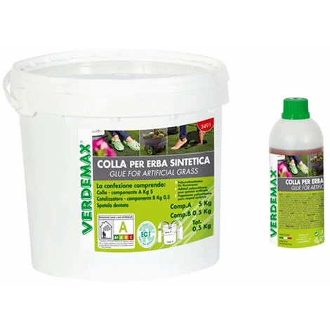 Questa colla per prati sintetici, è indicata per il fissaggio del prato al terreno, mediante banda di giunzione. Colla da miscelare con catalizzatore, che ne attiva la presa. Utilizzare la spatola dentata per stendere la colla. La confezione comprende: colla 5,5 kg, catalizzatore 0,5 kg, spatola dentata.