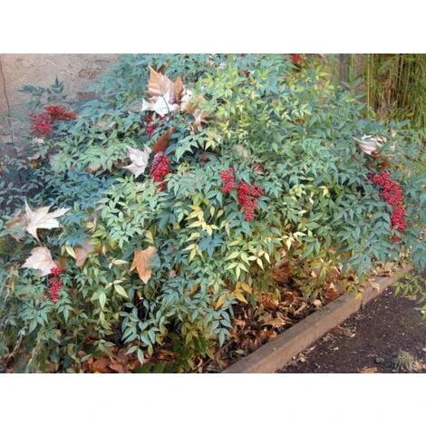 Nandina Domestica e’ una pianta a fogliame composto da foglioline strette e allungate, persistente. In primavera le foglie sono di color verde lucente, in autunno, ramato e in inverno color rosso scarlatto.