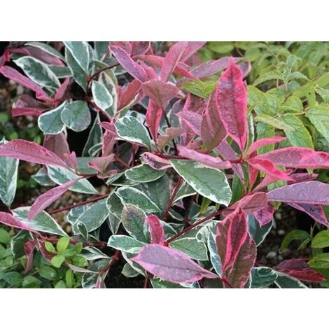 Photinia a foglie variegate di tre colori: sono verdi variegate di bianco e rosa-rosso. Fiori bianchi in primavera.